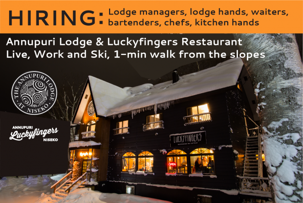 アンヌプリのLuckyfingersでは、日本人キッチンスタッフ(1名/未経験者歓迎/バイリンガル優遇)と日本人フロアスタッフ(女性1名/未経験者歓迎/バイリンガル優遇)を探しています。アンヌプリゴンドラから徒歩2分という好ロケーションのレストランで、NYから毎シーズン来日する有名日本人シェフと一緒により良い店作りに参加してくれる、熱意のある方を探しています。詳細に関しては随時お問い合わせ下さい。info@luckyfingersniseko.com